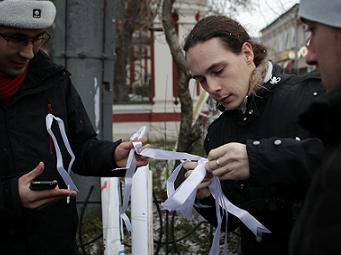 Три студента были задержаны в центре Москвы при попытке украсить белыми ленточками улицу, по которой сегодня днем пройдет шествие за честные выборы.
