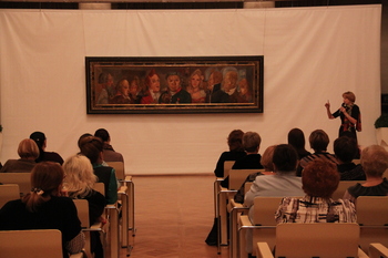 Вела мастер-класс доцент Герценовского университета Татьяна Рыжкова. Она построила встречу как диалог, в котором учителя совместно с ведущей рассматривали картину, читали ее как художественный текст, обращая внимания на мельчайшие детали, разгадывали загадки картины, пытались раскрыть замысел художника. Конечно, на занятии обращались и к тексту \”Ревизора\”, а также к написанной Гоголем через 10 лет после выхода комедии \”Развязке \”Ревизора\”.