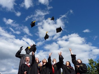 Завершилась церемония вручения дипломов одновременным подкидыванием академических шапочек: в воздух взметнулись шесть тысяч головных уборов.