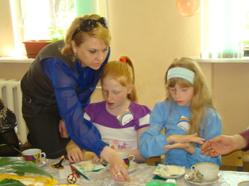 Мастер-класс. Работа с соленым тестом. Ребята вместе с родителями на картоне лепят цветок в память о заседании КВД. Мастер-класс проводит А.В. Сеидова.